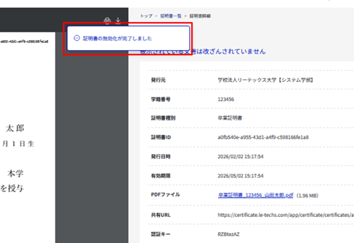 3.無効化が完了すると画面上部に「証明書の無効化が完了しました」という通知が表示されます。