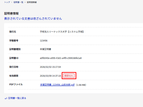 ※有効期限が切れた証明書を以下のいずれかの方法で閲覧した場合、「電子署名の有効期限が切れています」という文言が表示されます。
